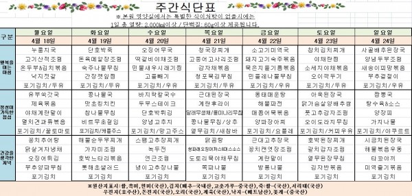 2022.04.18~2022.04.24 주간식단표 페이지 정보 작성자 dldmsdud 작성일22-04-14 17:07 조회1,251회 댓글0건 관련링크 이전글 다음글 목록 답변 본문 댓글목록 등록된 댓글이 없습니다. 이전글 다음글 목록 답변